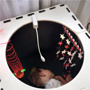 S úspěchem jsme s několika dětmi vyzkoušeli „černý pokojíček“, sestavený z velkých pěnových podložek (60 x 60 cm). Podložky se snadno spojují, jsou měkké a lehké. Použili jsme celkem 5 desek, z kterých jsme sestavili krychli bez jedné stěny. Na horní vroubkované okraje se snadno zavěšují různé hračky, případně doplněné světýlkem. Vhodné je také použít lampičku na klip, kterou můžeme hračky uvnitř nasvítit. Naše podložky mají jeden díl s kruhovým otvorem, který jsme umístili nahoru. Momentálně se nám nepovedlo najít v nabídce žádného obchodu stejné podložky, ale dobře poslouží srovnatelné černé, rozměru 60 x 60, které nabízí řada e-shopů.