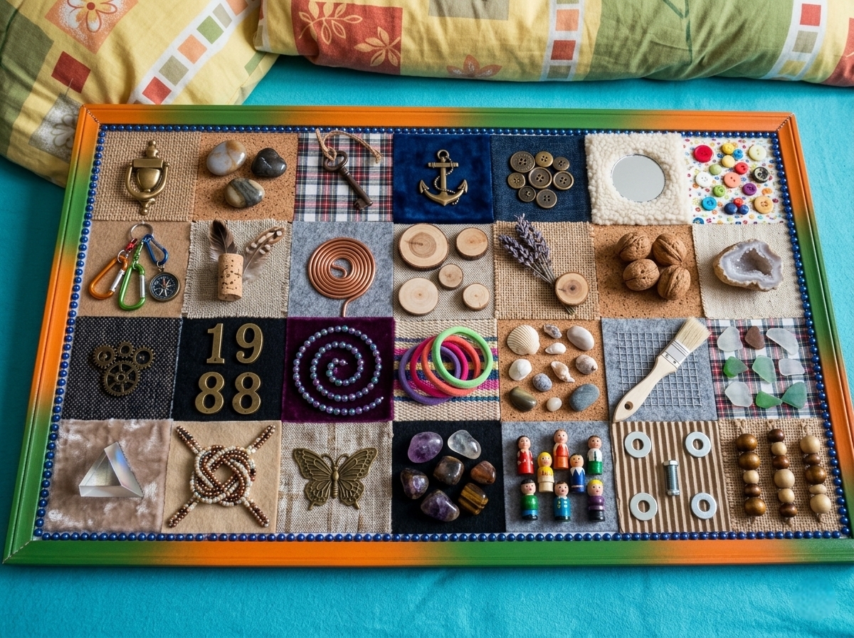 A poté je to již jen na vaší fantazii. Na každý z vytvořených čtverců nalepíme hmatově zajímavý materiál, například karabinku s klíči, kliku, světýlko na kolo, malé DVD či zrcátko (zapuštěné v koberci, aby se dítě nezranilo). Čtverce, které jsou samy o sobě hmatově zajímavé, můžeme nechat volné.