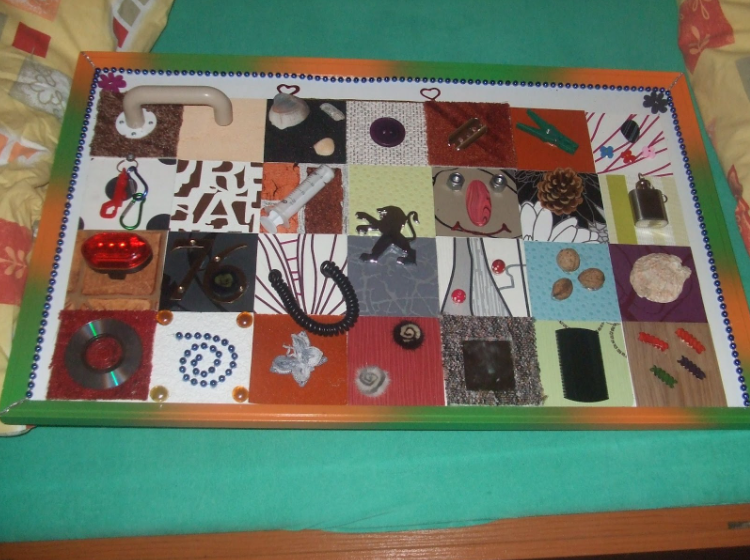 Dnes již seženete fotorámečky různých tvarů, například více rámečků spojených dohromady (viz fotogalerie). Tento druh rámečku vám poslouží jako malé oddělené prostory, do kterých můžete vlepit různé hmatově zajímavé materiály. Vznikne tak trochu jiný druh hmatové desky.
