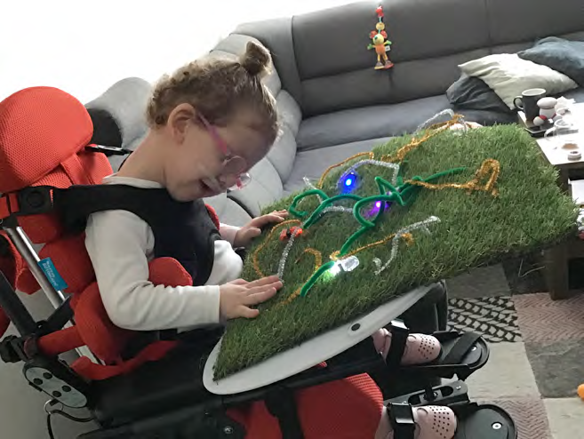 Trávníček je pro děti hmatově zajímavý, stimuluje ručičky a čističe jsou pro děti výzvou ke zkoumání. Se světýlky pak můžeme díky odleskům podporovat současně sledování zrakem, přenos pozornosti mezi světýlky a drátky, děti mohou také pozorovat vlastní ručičky při hmatání.