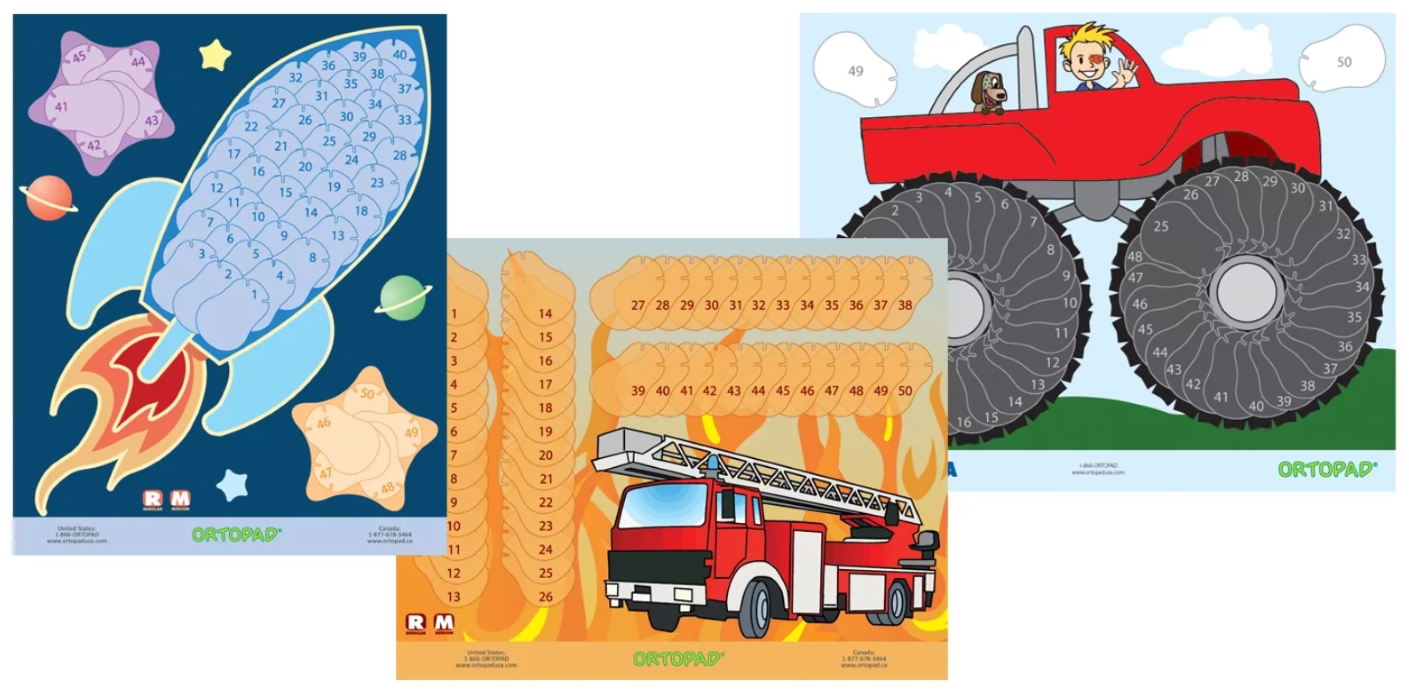 Pod názvem ortopad patching reward posters najdete spoustu plakátů, přímo vytvořených k nalepování okluzorů, zkuste se na ně zeptat v místě kde kupujete okluzory.