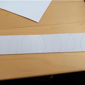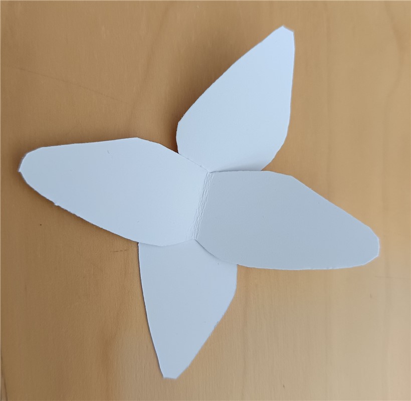 Delší okraj papíru si přeložíme, aby nám vznikl zhruba 5 cm široký pruh (podle toho, jak velké sněženky chceme mít). Tužkou si načrtneme tvar lístku, stříháme přeložený papír tak, že nám vznikne jeden dvojlist. Dva takové dvojlisty překřížíme a jehlou prošijeme, připevníme k nim rolničku a libovolně velký korálek (který celou sněženku zatíží, aby dobře visela).