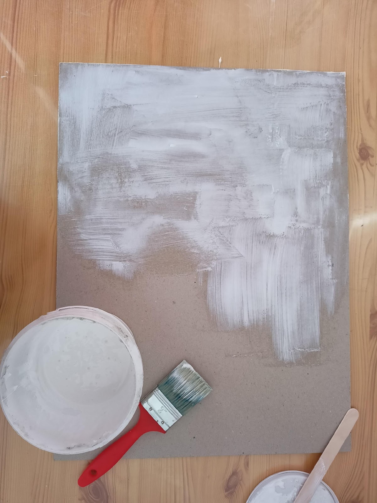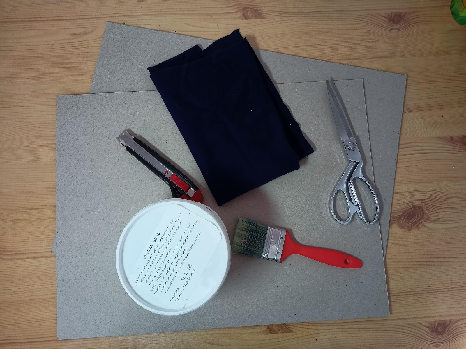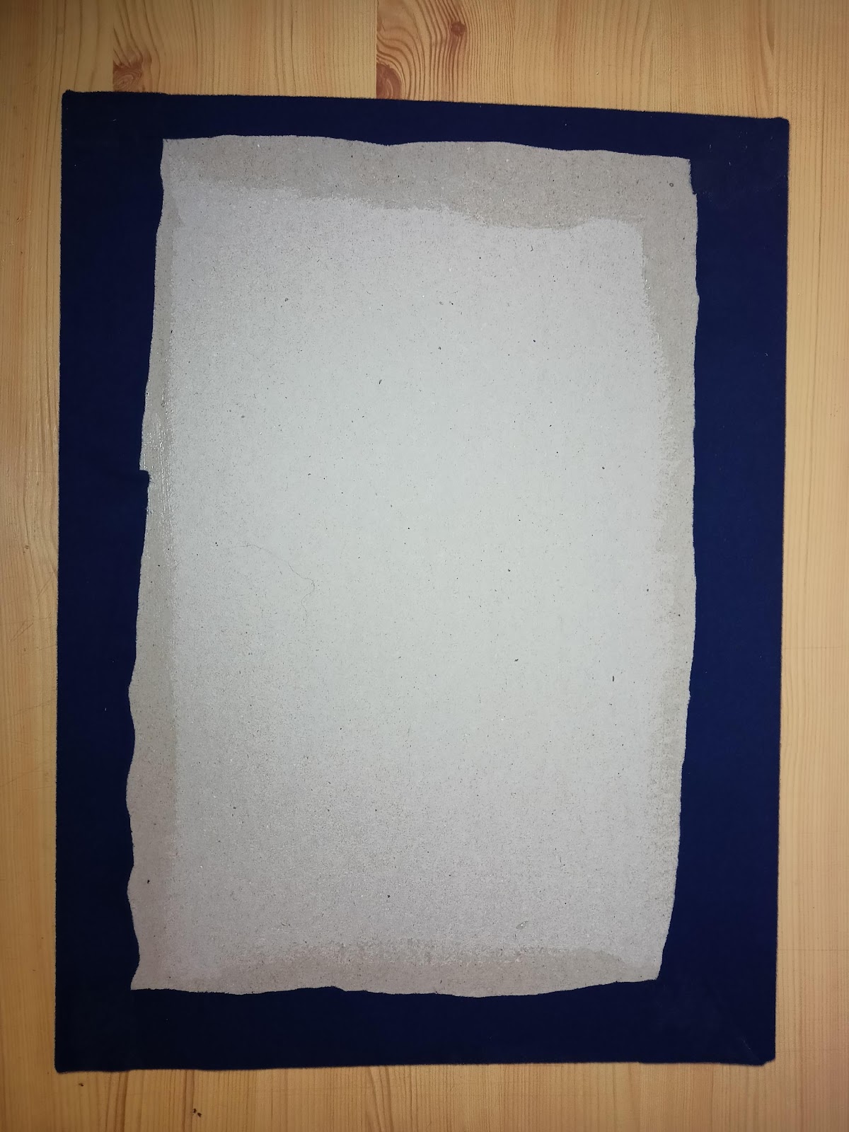 Z česaného silonu odstřihneme kus tak velký, aby z každé strany desky přesahovalo cca 10 cm látky. Karton natřeme z jedné strany lepidlem a přiložíme na něj česaný silon. Lepidla nesmí být moc silná vrstva, aby neprosáklo přes látku. Až lepidlo zaschne, otočíme desku na druhou stranu a přilepíme přesahující látku. Nakonec natřeme druhý kus kartonu lepidlem a přilepíme na spodní stranu, kde jsou vidět přilepené přesahy látky. Je lepší, když je spodní karton na suchozipové desce o něco menší než kus přední