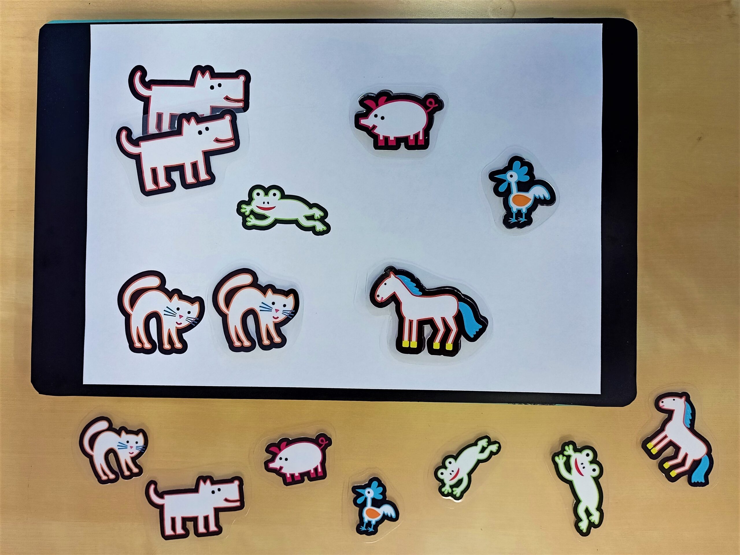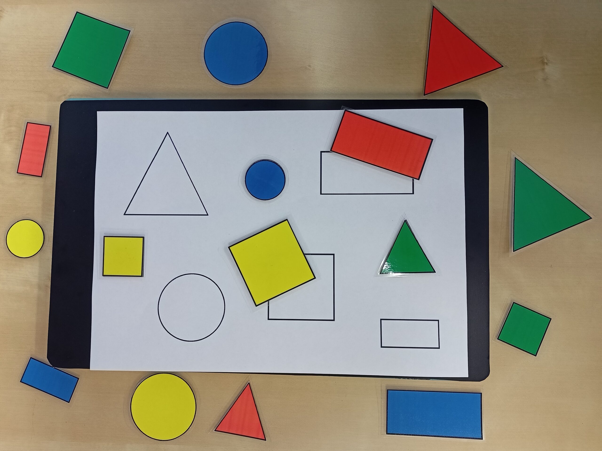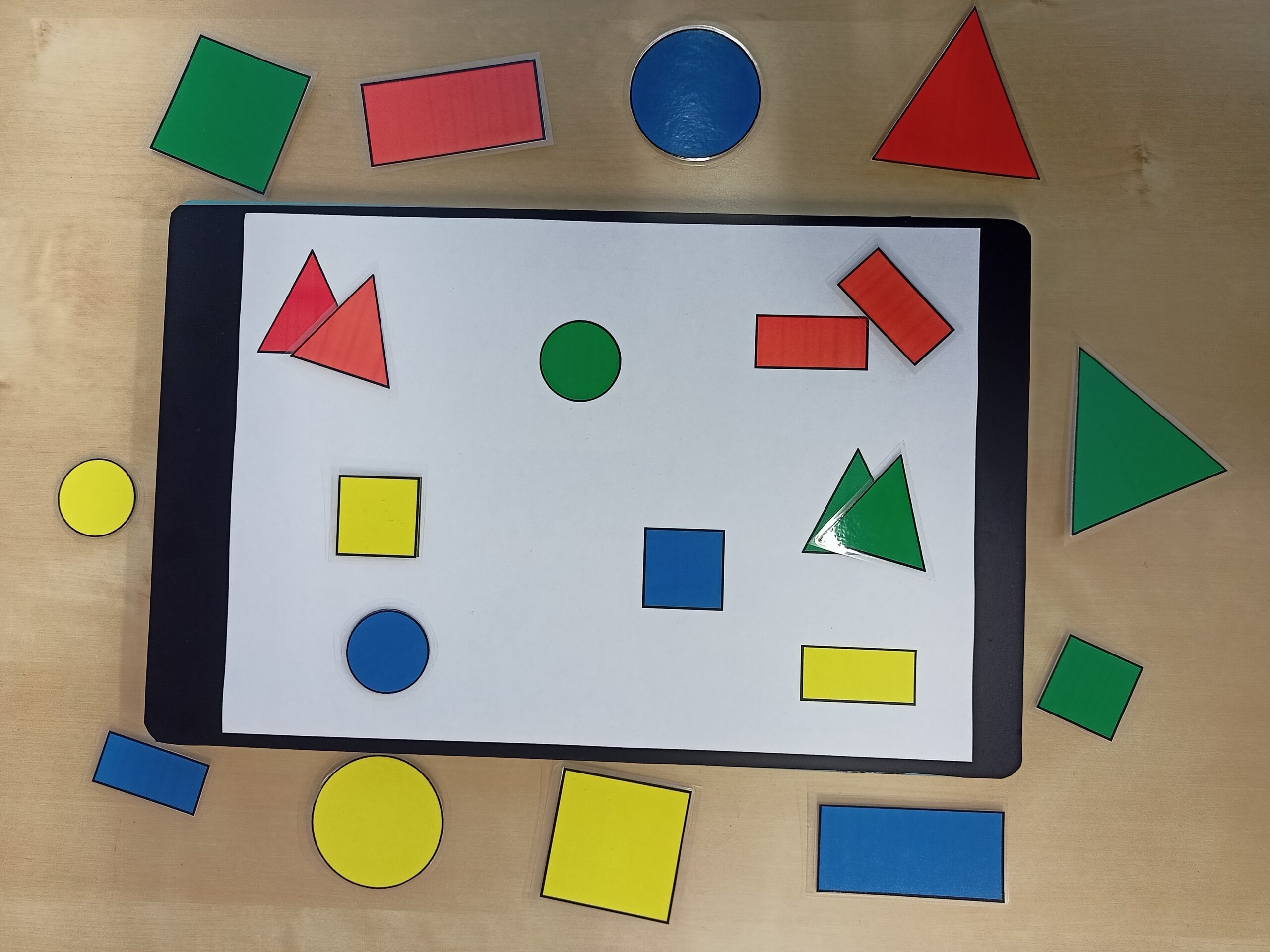 Můžeme vytvořit různě barevné a velikostí odlišné tvary. Dítě může tvary řadit za sebe, třídit do skupin podle barvy či velikosti, hledat k velkému tvaru malý atd. Obrázky lze využít k nácviku složitějších pokynů – například „polož modrý čtverec nad zelené kolečko a červený obdélník vedle kolečka…”